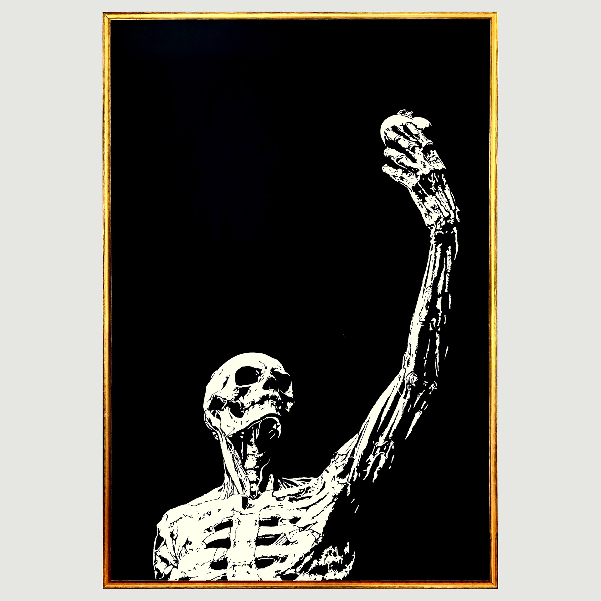 This macabre portrait of a rotting corpse, raising its own heart to behold, is Collins' second interpretation of Ligier Richier's "Le Transi de René de Chalon" (also known as "Le squelette"), a life-sized transi of the Prince of Orange from the mid sixteenth century. Collins discovered the Richier's late gothic, funerary, cadaver monument during a sojourn to Paris, France. That sculpture inspired Collins' earlier work, "All Things Must Die", a limited edition lithograph.